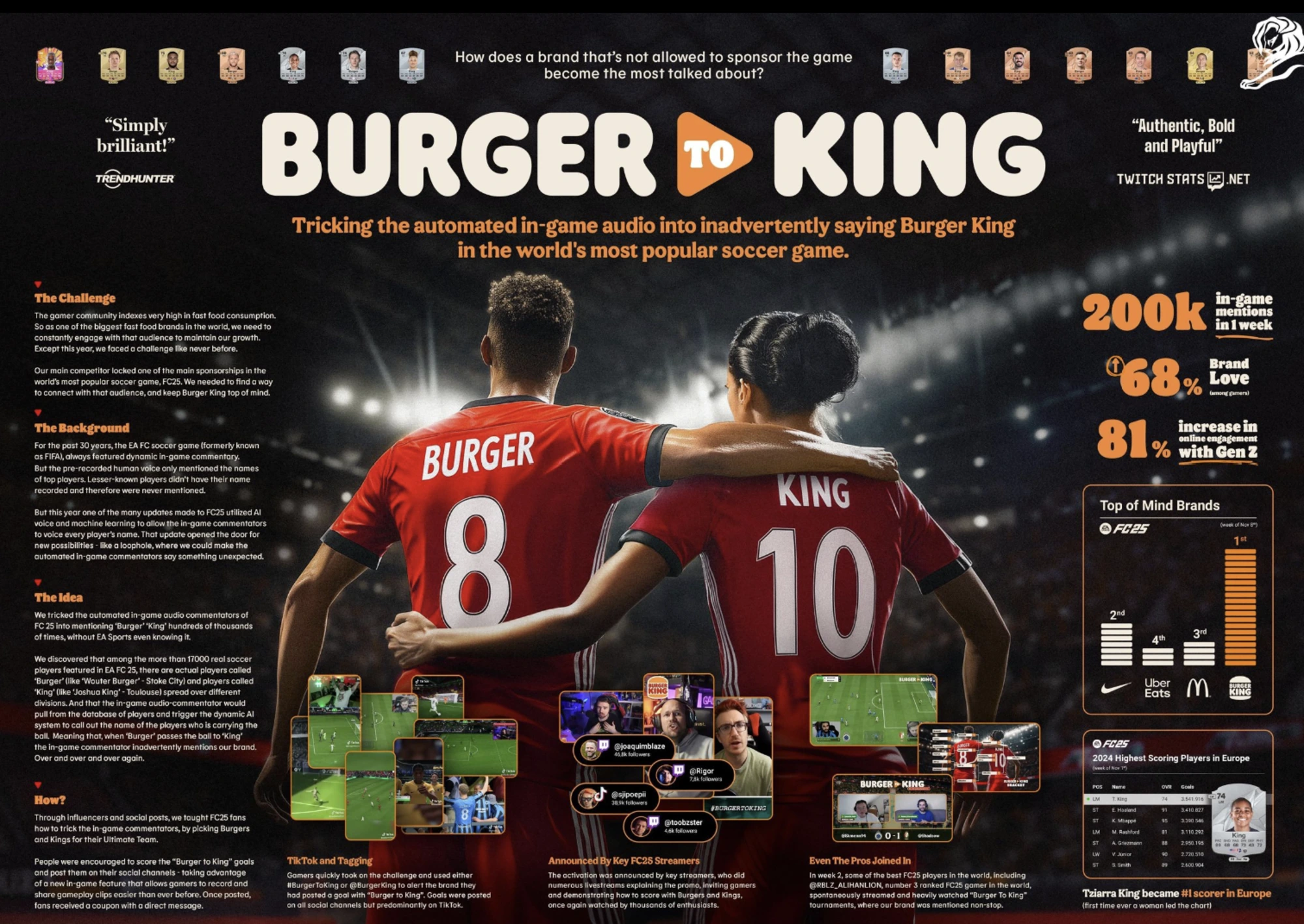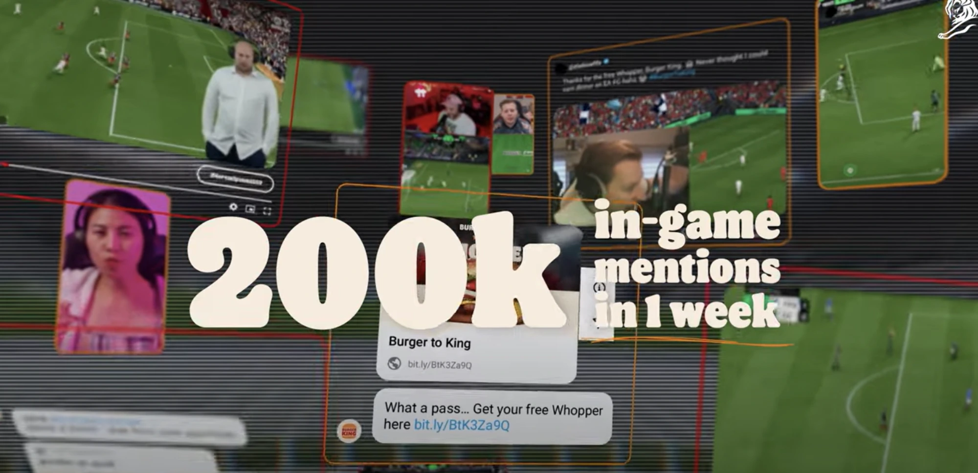 In week 2, even the pro’s joined in. Some of the best FC25 players in the world, including @RBLZ_ALIHANLION, number 3 ranked FC25 gamer in the world, spontaneously streamed and heavily watched “Burger To King” tournaments, where our brand was mentioned non-stop. Ultimately creating the first ever unofficial in-game audio sponsorship. The ‘Burger to King’ gaming-hack resulted in a +81% increase in online engagement within gaming community. +2Million people saw at least one goal from Burger to King generating +217% ‘Burger King’ content consumption within gaming community. Boosted positive sentiment from 60% to 95% after the first campaign period.